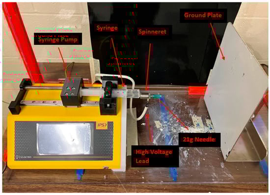 Electrospinning is the process of drawing out fibers by exposing a conductive solution to a strong external electric field [1,2,3]. High voltages are applied to a spinneret through which the solution passes. As the voltage increases, the conductivity of the solution extrudes the fluid into an elongated droplet shape known as a Taylor cone. Once the charge concentration on the Taylor cone exceeds the surface tension of the fluid, a single jet is ejected, producing ultrafine fibers [2,3,4,5,6,7,8]. These fibers undergo further thinning as they propagate towards the grounded collection plate [2,3,6,8,9,10]. Fibers produced during electrospinning can reach diameters ranging from several nanometers to a few micrometers [1,11,12,13]. This makes them highly sought after due to their extensive applications in filtration and medical fields [1,5,6,8,9,11,12,13,14,15].