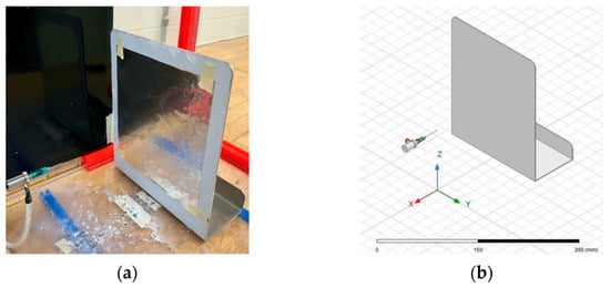 (a) Physical electrospinner parallel-plate setup; (b) ANSYS simulation electrospinner parallel-plate setup.