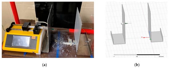 The first goal of the study was to understand the electric fields produced within two different electrospinning configurations, namely a needle–plate configuration and a parallel-plate configuration. In order to understand the morphology of the electric field, a replica of each electrospinning apparatus was modeled using the finite element software, known as ANSYS Maxwell (ANSYS, Canonsburg, PA, USA). Figure 2 shows the physical and simulated needle–plate configuration, while Figure 3 shows the physical and simulated parallel-plate configuration. ANSYS Maxwell uses finite element modelling (FEM), which is performed by subdividing the model into smaller pieces, a process known as meshing. Maxwell’s equations are applied to each mesh component in order to compute the electric field vector at each point in space. These vectors are then combined to form a vector field, which describes the electric field within the prescribed region.