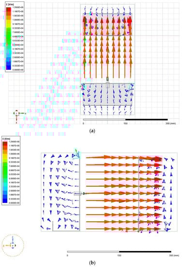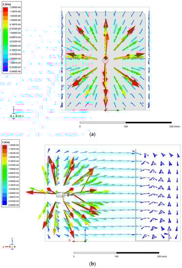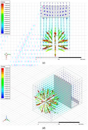 In order to replicate the conditions of the electrospinning setup as realistically as possible, the copper connector clamped between the spinneret in Figure 2 was assigned a voltage of 20 kV. The collection plate was grounded and placed 12 cm from the needle tip. The simulation was performed prior to the trialing with the parallel-plate setup; therefore, the exact electric field strength was not 1.7 kV/cm. Figure 5a–d show ANSYS Maxwell simulations of the electric field that was generated within the needle–plate configuration.