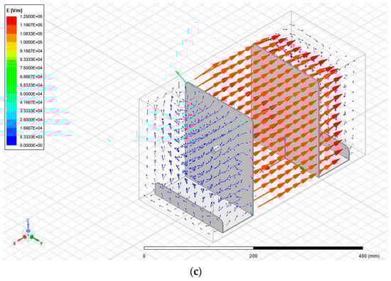 It is apparent from Figure 5a–d that the electric field that was generated in the needle–plate electrospinning configuration was highly non-uniform, which was expected. The non-uniformity was due to the electric field originating at a point and expanding towards a large plate. The electric field did reach a point of uniformity close to the collection plate; however, the strength of the field dropped significantly. Figure 6a–c below show the electric field generated within the parallel-plate configuration.