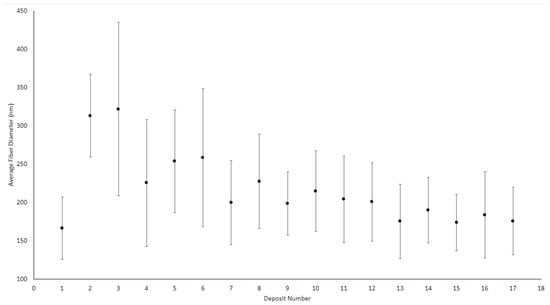 Of the 17 deposits produced, the first 9 were obtained using the parallel-plate configuration. All parallel-plate deposits were produced in a single day except for the first. The first deposit was produced the day before the others, where the average ambient humidity was 59.2%. On the second day, the ambient humidity ranged from a minimum of 77.9% to a maximum of 80.1%. Table 3 summarizes the average fiber diameters of all 17 deposits, and Figure 7 plots the average fiber diameters. The average fiber diameters and uncertainties were calculated from the three images taken for each deposit, each consisting of 30 measurements. Therefore, each deposit diameter is an average calculated from 90 measurements (in reality, most are 89 measurements due to the rejection of a single outlier in most cases).