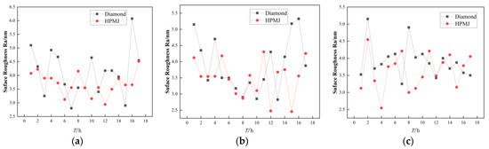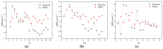 Observe in Figure 6 that the MRR of the SiC wafers first showed an increasing trend and then a decreasing trend with increasing use time when the polyurethane polishing pad was used in the CMP experiments with the diamond conditioner; the overall removal rate was in the range of 1.80–4.14 μm/h. At a polishing time of 10 h, the removal rate was only 2.13 μm/h, indicating a decrease of 48.6%. The reason for the decrease in the removal rate is that most of the abrasive grains fill the holes of the polishing pad during the initial time and only a small portion of the grains are involved in the polishing process, resulting in a low wafer MRR. Subsequently, the holes of the polishing pad were filled with abrasive particles; the upper layer of abrasive particles that filled in the holes was involved in the removal process. At this time, polishing slurry dripping remained and additional abrasive particles were scattered on the surface of the polishing pad, increasing the wafer MRR. At a polishing time of 10 h, the removal rate was only half of the maximum value; accordingly, the wafer MRR tended to decrease as the experimental time increased, which can be attributed to the hardening of the polishing pad resulting from the polishing pad holes being completely filled with abrasive grains (the polishing pad hardness was measured before and after the experiment using a Shore durometer. The experimental result exhibited an initial hardness of 75 HD and hardness of 83 HD after 20 h), which decreased the polishing pad performance.
