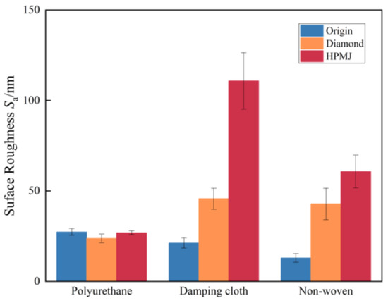 It can be observed from Figure 7 that the initial surface roughness Sa of the polyurethane polishing pad was 27.33 nm and the Sa value of the polishing pad surface conditioned with the diamond conditioner decreased to 23.75 nm after nearly 20 h of use. This is also because the holes in the polyurethane polishing pad are filled with abrasive grains, resulting in a flattening of the pad shape; the Sa value of the polishing pad conditioned with HPMJ was 26.87 nm, which is very close to the initial surface roughness. The initial surface roughness Sa of the damping cloth polishing pad was 21.23 nm and the Sa value of the surface increased to 45.72 nm in the polishing pad conditioned with the diamond conditioner after nearly 15 h of use. The increase in roughness can be attributed to the destruction of the pore structure on the damping cloth surface and a disordered internal fiber structure, increasing the measured Sa value, while the Sa value of the polishing pad with HPMJ conditioning was 110.84 nm. This indicates that, although the polishing pad also reveals the internal fiber structure, the HPMJ conditioning method can clean up the residual abrasive particles on the surface to significantly improve the Sa value.