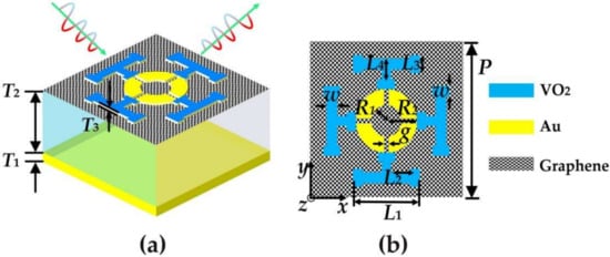 A 3D schematic of the designed broadband-narrowband and dual-broadband terahertz metamaterial absorbers and a top view of the x-y plane are shown in Figure 1a,b. The absorbers consist of four layers, from bottom to top, a metal mirror layer, an insulator layer, a single graphene layer, and a VO2-gold (Au) pattern layer on top. As shown in the Figure 1, the structure of the absorber unit is arranged periodically in the x and y directions with P = 40 µm. The thickness of the bottom gold is T1 = 200 nm. For the insulation layer, the thickness is T2 = 9 µm. We assume that the material is lossless and the relative dielectric constant is 1.96 []. The VO2-Au pattern layer on the top layer is composed of an Au-ring with a cross opening and four T-shaped VO2 resonators. Among them, the thickness of VO2 layer T3 = 200 nm, the geometric parameters are L1 =17.5 µm, L2 = 5 µm, L3 = 4.5 µm, L4 = 6 µm, W= 2.5 µm; the optimization parameters of the cross-shaped open metal ring located in the center are R1 = 4 µm, R2 = 8 µm. g = 0.625 µm; and the thickness is consistent with T3, where the conductivity of gold, σ gold = 4.09 × 107 S/m []. The metal as a reflective layer can ensure that almost all incident THz waves are reflected, thus inhibiting transmission.