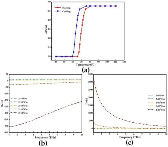 In Equation (6), σ0 = 3 × 105, = 1.4 × 105, σ is the VO2 conductivity. When the temperature changes, VO2 can be converted from an insulating phase to a metallic phase []. Figure 2a shows the relationship between the conductivity of VO2 and the ambient temperature. At room temperature, VO2 presents an insulating phase with a conductivity of 20 S/m. When the temperature reaches the phase transition temperature, VO2 is in the metallic phase and the conductivity is 2 × 105 S/m. Figure 3b,c shows the relationship between the real parts (Re (ε))and imaginary parts (Im (ε)) of the relative dielectric constant of VO2 under different phase transitions, respectively. It is noted that the Re (ε) is the symbols from positive to negative. When VO2 is exchanged from the insulating phase (10 S/m) to the metallic phase (2 × 105 S/m), Im (ε) completely increasing by degrees.