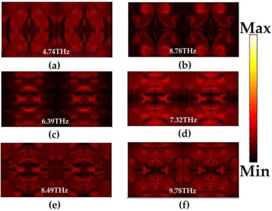 Electric field distribution of a broadband absorption and narrowband absorption: (a) 4.74 THz; (b) 8.78 THz; (c) 6.39 THz; (d) 7.32 THz; (e) 8.49 THz; (f) 9.78 THz.
