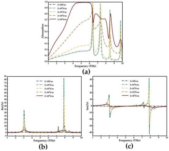 In order to understand the underlying physical mechanism of the absorption phenomenon, impedance matching theory is used. Among them, the influence of different electrical conductivity on absorption spectra during the phase transition of VO2 is shown in Figure 5a. The results show that when VO2 is in the metallic phase (σ = 2 × 105 S/m), the absorbers have remarkable performance in broadband and narrowband, respectively.