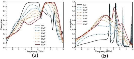 It can be seen from Equation (4) that the surface conductivity of graphene is not only related to the angular frequency and relaxation time of the incident electromagnetic wave, but also to the Fermi level. Therefore, we adjust the surface conductivity of graphene by applying a bias voltage to it to change the Fermi level of graphene. In this paper, the Fermi level is chosen as Ef = 0 eV and carrier relaxation time = 0.1 ps for broadband and narrowband absorption.