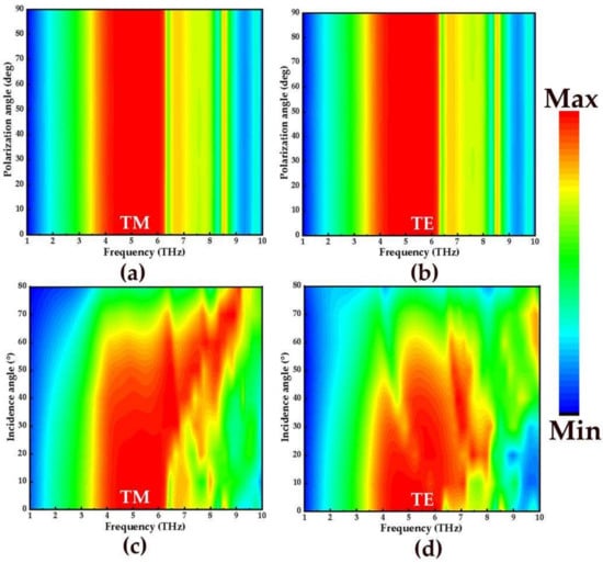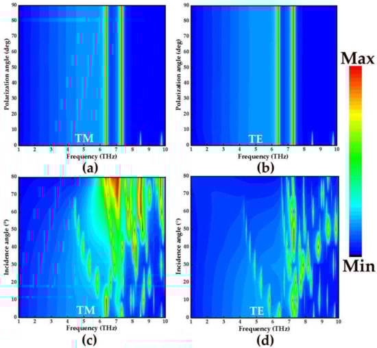 Finally, in order to study the absorption effect of the absorber under oblique incidence, the broadband and narrowband absorption spectra with the polarization angle from 0° to 85° and incident angle from 0° to 85° with step size of 10° are simulated in the frequency range of 1–10 THz. Figure 7a,b and Figure 8a,b show the absorption spectra of broadband and narrowband absorbers under TM and TE polarized waves, respectively. Obviously, with the increase of the polarization angle, the broadband absorption rate and narrowband absorption rate did not change. Therefore, the proposed absorber is insensitive to the polarization angle. This may be due to the complete symmetry of the designed structure. In addition, the influence of different incidence angles on the absorption of TM and TE waves in broadband and narrowband is also studied. Figure 7c,d shows the absorption spectra of the broadband absorber at the incidence angles of TM and TE, respectively. As shown in Figure 7c, when the angle is lower than 55°, the absorption effect of 3.85–6.32 THz in the TM polarization state is better. However, when the incident angle exceeds 55°, the stable absorption of the broadband absorber is disturbed. The reason is that the tangential component of the electric field decreases with the increase of the incident angle. For TE incidence in Figure 7d, the absorption amplitudes can remain above 90% in the frequency range of 3.85–6.32 THz when the incidence angle reaches 20°. Figure 8c,d shows the narrowband absorption rates of TM and TE waves as functions of frequency and the incidence angle. For normal incidence, the absorptivity of the absorber has four absorption peaks at the frequencies of 6.4 THz, 7.32 THz, 8.49 THz, and 9.78 THz, and the absorption levels are about 95.2%, 97%, 89.1%, and 73.3%. For the TM polarization in Figure 8c, the number of absorption amplitudes increases as the incidence angle approaches 60°, and at the frequencies of 6.55 THz, 7.71 THz, 7.95 THz, 8.50 THz, and 9.78 THz, the absorption levels approach 96.4%, 99.6%, 94,5%, 95.5%, and 99.8%, respectively. As for TE incidence in Figure 8d, when the incidence angle is 30°, the number of absorption peaks increases gradually. When it is increased to 40°, five absorption peaks appear in the range of 6.86–8.77 THz, and the absorption amplitudes are all above 90%. With the increase of incidence angle, the absorption rate of the TE and TM wave at different polarization angles and incident angles decreases slowly, and the blue shift of frequency is strong.