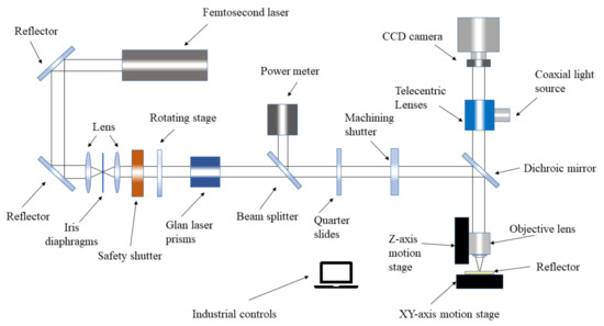Based on the femtosecond laser TPP micro-nano processing principle, a femtosecond laser TPP micro-nano fabrication platform was established. The fabrication platform mainly consists of an optical system and a three-dimensional processing platform (as shown in Figure 2). The entire fabrication platform was built in a clean room with constant temperature, humidity, and ventilation. The Vitara Ti: sapphire femtosecond laser generator (Coherent, CA, USA) was introduced as the seed light source. The repetition frequency of the oscillator is 80 MHZ. The pulse width of the femtosecond laser is 15 fs, with an output power of 1000 mW and a center wavelength of 800 nm. Emitting from the seed light exit port of the laser generator, the femtosecond laser is reflected by a reflector and passes through a safety shutter. Then, the femtosecond laser enters the laser energy automatic adjustment system composed of a rotating stage with a half-wave plate, a Glan prism, a beam splitter, and a power meter. The processing detection software can control the rotation angle of the rotary stage to precisely adjust the processing power, and the power meter can measure the current processing power in real time. Then, the laser passes through the quarter-wave plate and enters the processing shutter. The platform uses a 650 nm short-wave pass dichroic mirror to realize the total reflection of the laser and the transmission of natural light. Finally, the laser beam is closely focused with an objective lens (magnification of 50, NA of 0.95) on photoresists.