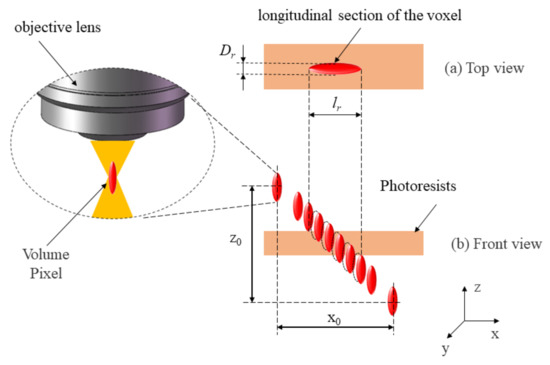 The following experiments were performed to study the size and shape of voxels. According to Zhou’s study [7], the laser power, the micro-machining speed, and the properties of the photoresist material are three critical parameters that influence the width ( Dvoxel) and length (lvoxel) of the voxel. To calibrate the resolution of 2D TPP, a series of experiments based on the orthogonal decomposition method was designed. The variation area of the laser power and the machining speed is shown in Table 1, where the machining speed V is the combined speed of the X and Z axes speed. During the experiments, the X and Z axes of the 3D processing platform were controlled to move at the same speed (vx = vz). As the TPP platform scans the photoresist at 45°, the calibration method was named the 45° scanning method. First, the laser focus was moved to the top of the photoresist. With the movement of the X and Z axes, voxels are formed on the photoresist until the laser focus leaves the photoresist (as shown in Figure 3). During this process, voxels are formed at the maximum light intensity of the laser focus, and the exposed area of the photoresist reacts. The thickness of the photoresist (lphotoresist) is 500 nm. After the development of the photoresist, the reaction area was observed through the microscope, which is the longitudinal section of the voxel. The length of the reaction area lr = lvoxel + lphotoresist. The width of the reaction area Dr = Dvoxel.