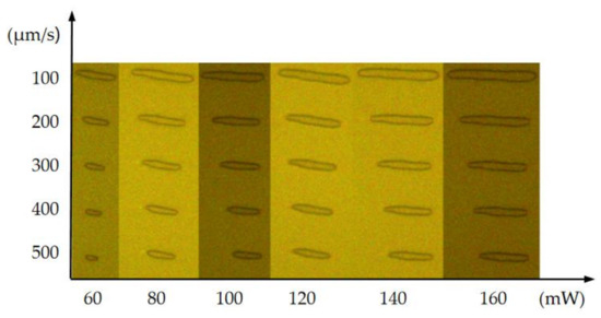 Thirty sets of experiments were carried out on the basis of the orthogonal decomposition method. The longitudinal cross-section of S1805 voxels under different laser powers and machining speeds is shown in Figure 4. The size of the voxel increases with increasing laser power and decreases with increased processing speed.