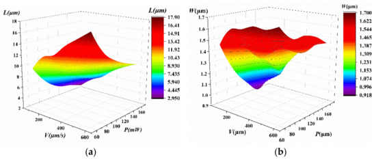 3D plots of (a) the length and (b) the width of voxels on the S1805 photoresist with respect to the laser power and the machining speed.
