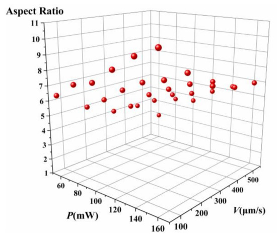 Then, another critical parameter of the voxel, the aspect ratio—which is the ratio of the voxel’s length and width—was studied. For the 2D TPP, the voxel length should be as large as possible, and the voxel width should be as small as possible. Therefore, the aspect ratio of the voxel should be large enough to ensure processing accuracy and avoid insufficient exposure or exposure failure. A reasonable combination of processing speed and laser power can meet the requirements. The scatter diagram of the aspect ratio of the voxel with respect to laser power and machining speed is shown in Figure 6. The aspect ratio can reach 8.13 with a power of 160mw and a machining velocity of 100 μm/s.