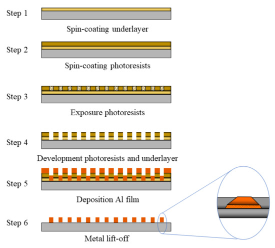To confirm whether the resolution of the micro-nano-structures fabricated by 2D TPP is consistent with the width of the voxel, a group of micro-nano-structures was fabricated. A typical process of the TPP laser direct writing process to fabricate micro-nano structures is as follows (Figure 7): (1) the substrate (soda-lime glass) is cleaned using an ultrasonic machine with acetone, ethyl alcohol, and deionized water for 6 min each. (2) A underlayer (LOR 10B) with a thickness of 1 μm is spin-coated on the surface of the substrate. Then, the underlayer film is baked for 3 min at 150 °C (Figure 7 step 1). The underlayer is non-photosensitive but can dissolve in the ZX-238 solvent. (3) A photoresist film (S1805) with a thickness of 500 nm is spin-coated on the LOR 10B film. Then, the S1805 film is baked for 1 min at 115 °C (Figure 7 step 2). (4) 2D TPP is performed on the photoresist film, which is photopolymerizable (Figure 7 step 3). (5) The exposed photoresist film is developed by the ZX-238 solvent, and then a photoresist mask plate is obtained (Figure 7 step 4). (6) Metal lift-off technology [6] is performed. The substrate is aluminized and stripped to obtain aluminum wire grids (Figure 7 steps 5 and 6). The metal lift-off technology is a process of applying adhesive, exposing, and developing a mask with a specific shape on the substrate. After exposure and development, the substrate is aluminized and stripped to obtain aluminum wire grids. This section investigates the width of metal wire grids after aluminizing and stripping.