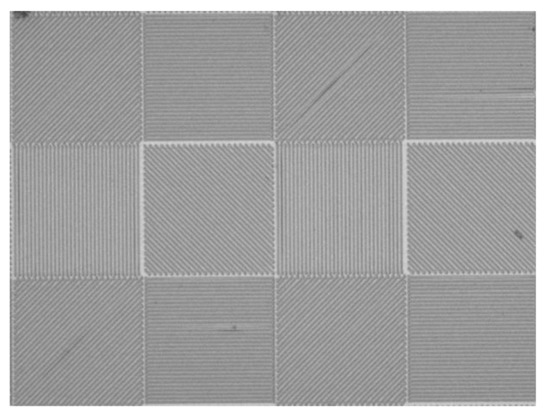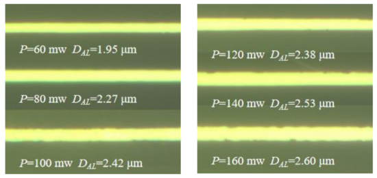 The S1805 photoresist is exposed by the femtosecond laser TPP micro-nano fabrication platform built in Section 2. The most significant factor that influences the width of the exposed line is the degree of exposure [22]. Meanwhile, the laser power and the processing speed are critical parameters that affect the degree of exposure. The S1805 photoresist was exposed to different laser powers and different processing speeds. The width of the aluminum wire grid (DAL) was measured under the microscope. As shown in Table 3, the width of the aluminum wire grid increases with increasing laser power and decreases with increased processing speed. Aluminum wire grids under a processing speed of 100 μm/s and laser power from 60 to 160 mW are shown in Figure 8. Aluminum wire grids are straight and smooth, which can meet the requirements of micro-nano structures. Full 2D grids have been fabricated using 2D TPP and the metal lift-off process. Figure 9 shows the top view of optical microscope images of the aluminum wire grids exposed with a laser power of 43 mW and a scan speed of 200 μm/s.