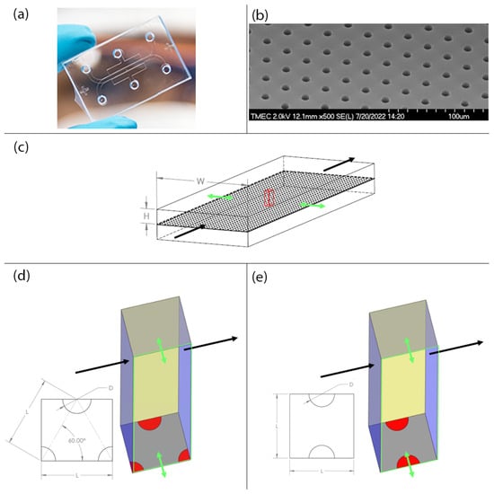 The computational domain surfaces are prescribed with the following boundary conditions. The left and right surfaces (blue) are prescribed with the periodic boundary condition. The top and bottom surfaces (grey) are set to the no-slip wall condition. The back side (yellow) is prescribed with the symmetry boundary condition. The front side (green outline) is prescribed with the symmetry boundary condition and also subjected to the peristalsis motion that stretches the domain in the direction perpendicular to the main flow forth and back (green arrows). The membrane is assumed to be very thin compared to the size of microchannel so that the membrane thickness is negligible and the symmetry boundary condition is applied to the circular sectors on the bottom surface (red) to mirror the presence of the flow in the lower microchannel. The total area of the circular sectors on the bottom surface of computational domain, i.e., the porous membrane, is equal to the area of a single circle as shown in Figure 1d,e.