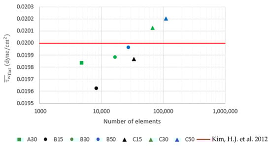 The mesh independent analysis is carried out using Case no. 1. The number of elements used across the domain height is initially set to 30 elements and three different surface mesh levels, i.e., A, B and C, which are defined as the factors of the pore diameter, D, are used to perform the simulation to find the optimal size of the surface mesh. After that, the number of elements used across the domain height is decreased to 15 and increased to 50 in order to find the optimal mesh. The area-weighted average shear stress, , on the flat surface (top surface) is calculated and validated with the shear stress reported by Kim et al. (2012) [14] as summarized in Table 2. The area-weighted average shear stress on the flat surface obtained from different meshes are plotted against their corresponding number of elements as shown in Figure 3. Note that the simulations are performed until the residuals are less than 1.0 × 10−6 for all mesh levels.