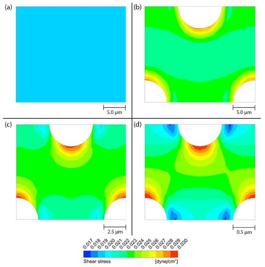 The contours of shear stress on different surfaces in the stationary microchannel. (a) Flat surface, (b) porous surface with the pore diameter of 10 µm, (c) porous surface with the pore diameter of 5 µm and (d) porous surface with the pore diameter of 1 µm.