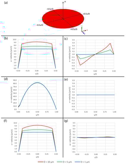 The velocity components over the different pore sizes are plotted along the three axes as shown in Figure 5a. Along the x- and z-axes, the larger pore size allows higher velocity to develop across its opening, as shown in Figure 5b,c,f,g, because the smaller pore causes more friction along its wetted surface. Along the y-axis, the u—velocity has the parabolic profiles for all pore sizes, as shown in Figure 5d and the v—velocity is zero, as shown in Figure 5e. It should be noted that the u—velocity profiles in Figure 5d are not symmetrical because, while the flow sticks to the surface at y/H = 1, it slips over the pore at y/H = 0. Additionally, the w—velocity along the x- and y-axes as well as the v—velocity along the z-axis are zero due to the symmetry boundary condition.