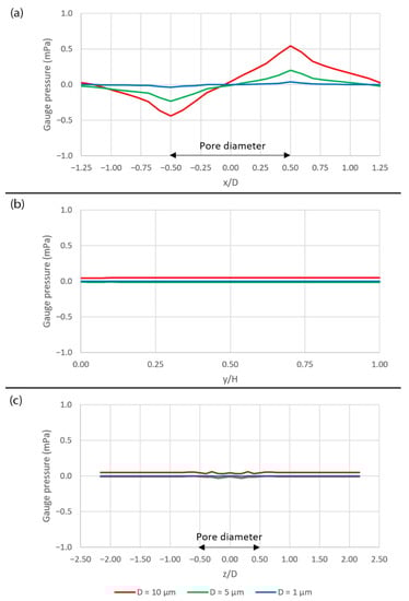 Figure 6 shows the plots of pressure across the domain over the pore area. Along the x-axis, the pressure decreases as approaching the pore and then increases across the pore. After that, the pressure starts decreasing again, as shown in Figure 6a. The pore area with the negative pressure attracts the fluid into the pore while the pore area with the positive pressure drives the fluid out of the pore. This phenomenon can be seen clearly in Figure 5c where the v—velocity is negative over the first half of the pore and becomes positive over the second half which reflects the coupling between the pressure and the velocity, as described by the Navier–Stokes equations (Equation (3)). The pressure is constant along the y-axis as shown in Figure 6b and also along the z-axis, except over the pore area where there are some fluctuations, as shown in Figure 6c.