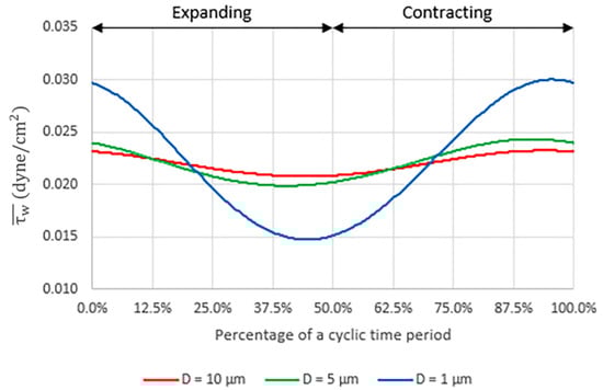 When peristalsis motion is present, the flow is disturbed by the cyclic deformation of the membrane which affects the shear stress behavior inside the microchannel. Figure 7 shows the plots of the area-weighted average shear stress, , on the porous surface with different pore sizes (Case no. 2, 4 and 6) during a deformation cycle. The time-averaged shear stresses per cycle, , are equal to 0.022003, 0.022052 and 0.022200 dyne/cm2 for the membrane with the pore diameters of 10 µm, 5 µm and 1 µm, respectively. Note that even though the time-averaged shear stresses are of the same magnitude in all three cases, the temporal variation is stronger with smaller pore diameter, that is, ±5.61%, ±10.12% and ±34.45% for the pore diameters of 10 µm, 5 µm and 1 µm, respectively.