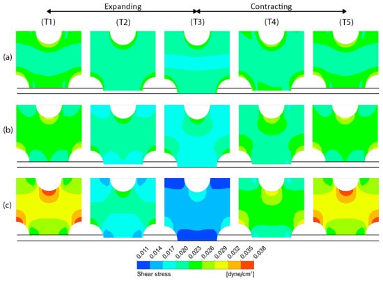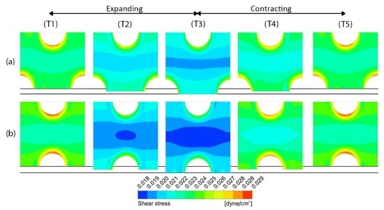 Figure 14 shows the difference between the shear stress distribution on the porous membrane surface with the pore diameter of 10 µm in case of the staggered pattern arrangement (Case no. 1) and that of the in-line pattern arrangement (Case no. 7), without peristalsis motion. The simulation results reveal that the area-weighted average shear stresses are 0.023174 and 0.022688 dyne/cm2 for the staggered pattern and the in-line pattern, respectively, where the difference is approximately 2%. The distributions of shear stress around the pore are similar in both cases. However, the contours of shear stress in the middle region between the pores are different. The contour in this region has a wavy pattern with higher shear stress in case of the staggered pattern, as shown in Figure 14a, while it has a bottleneck-like structure with lower shear stress in case of the in-line pattern, as shown in Figure 14b.