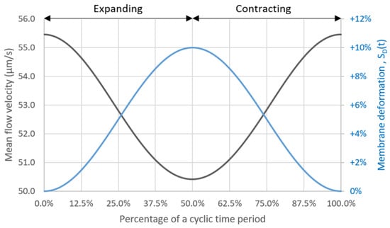 Furthermore, with the presence of peristalsis motion, the average shear stress is lower compared to that of the stationary microchannel. This is because the flow is temporarily drawn backward during the expansion phase which results in the lower mean flow velocity and hence the lower shear stress. The mean flow velocity is plotted together with the membrane deformation in a cycle as shown in Figure 9.