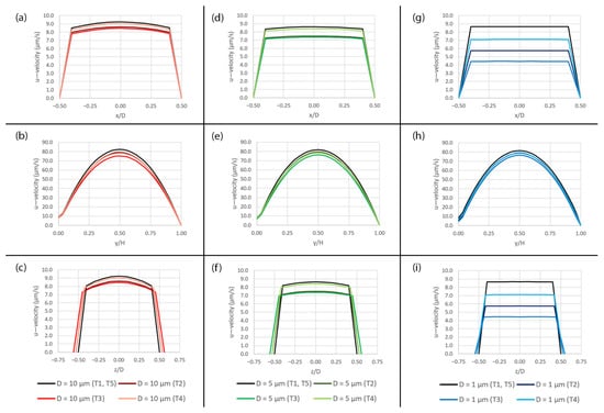 The plots of the u—velocity profile over the pore area subjected to peristalsis motion at five different time points (T1–T5) during a deformation cycle. (a) Along the x-axis over the 10 µm pore, (b) along the y-axis over the 10 µm pore, (c) along the z-axis over the 10 µm pore, (d) along the x-axis over the 5 µm pore, (e) along the y-axis over the 5 µm pore, (f) along the z-axis over the 5 µm pore, (g) along the x-axis over the 1 µm pore, (h) along the y-axis over the 1 µm pore and (i) along the z-axis over the 1 µm pore. The plot locations are shown in Figure 5a.