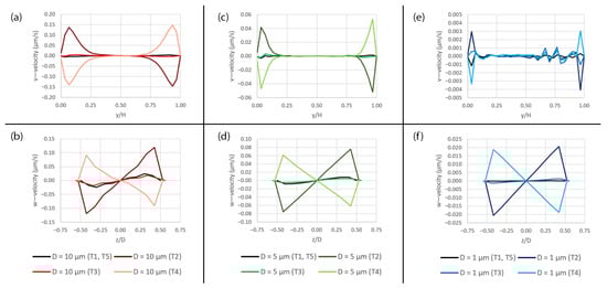 The plots of the v—velocity along the y-axis and the w—velocity along the z-axis over the pore area subjected to peristalsis motion at five different time points (T1–T5) during a deformation cycle. (a) Plots of the v—velocity along the y-axis over the 10 µm pore, (b) plots of the w—velocity along the z-axis over the 10 µm pore, (c) plots of the v—velocity along the y-axis over the 5 µm pore, (d) plots of the w—velocity along the z-axis over the 5 µm pore, (e) plots of the v—velocity along the y-axis over the 1 µm pore and (f) plots of the w—velocity along the z-axis over the 1 µm pore. The plot locations are shown in Figure 5a.