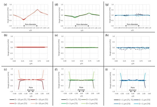 The plots of gauge pressure across the domain with different pore sizes at different time points (T1–T5) during a deformation cycle. (a) Along the x-axis over the 10 µm pore, (b) along the y-axis over the 10 µm pore, (c) along the z-axis over the 10 µm pore, (d) along the x-axis over the 5 µm pore, (e) along the y-axis over the 5 µm pore, (f) along the z-axis over the 5 µm pore, (g) along the x-axis over the 1 µm pore, (h) along the y-axis over the 1 µm pore and (i) along the z-axis over the 1 µm pore. The plot locations are shown in Figure 5a.