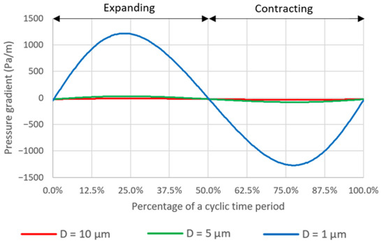 The average pressure gradients during a deformation cycle are −25.019, −25.172 and −25.731 Pa/m for the case with pore diameters of 10 µm, 5 µm and 1 µm, respectively. The pressure gradient across the domain varies with time in a deformation cycle as shown in Figure 13. It should be noted that the magnitude of pressure gradient increases dramatically as the pore diameter decreases. It is speculated that this is because the simulation domains are scaled down, in both x- and z-axes, according to the pore diameters which are 2 times and 10 times smaller for the cases with the pore diameters of 5 µm and 1 µm, respectively, compared to the case with the pore diameter of 10 µm. The smaller domain can be described as a smaller flow passage which would have the higher flow resistance and thus require the greater driving force, i.e., pressure gradient, to push the fluid through.