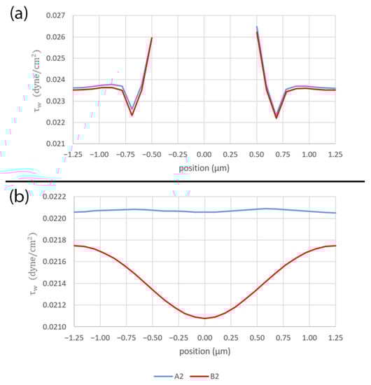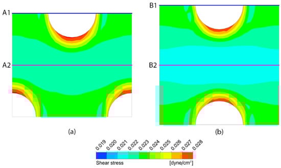 Figure 15 shows the shear stress profiles along the flow paths: (a) across the pore (A1 and B1 lines in Figure 14) and (b) between the pores (A2 and B2 lines in Figure 14). Across the pore, the shear stress profiles are almost identical for both pattern layouts, as shown in Figure 15a. However, in the middle region between the pores, although the contour has a wavy pattern in case of the staggered pattern layout, the shear stress profile is almost constant along the A2 line at 0.022070 dyne/cm2. On the contrary, although the contour seems to suggest a linear profile, it has a stronger variation along the B2 line with the amplitude of ±0.000336 and the mean of 0.021433 dyne/cm2 in case of the in-line pattern layout, as shown in Figure 15b.