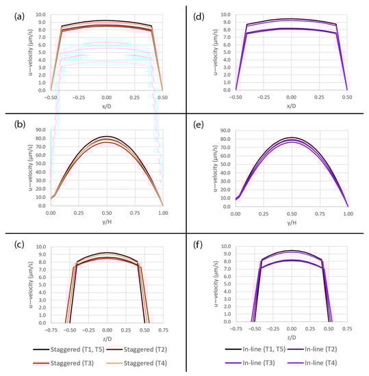 Plots of the u—velocity profiles over the pore with the diameter of 10 µm for two different pattern layouts at five different time points (T1–T5) during a deformation cycle. (a) Along the x-axis in the staggered pattern, (b) along the y-axis in the staggered pattern, (c) along the z-axis in the staggered pattern, (d) along the x-axis in the in-line pattern, (e) along the y-axis in the in-line pattern and (f) along the z-axis in the in-line pattern. The plot locations are shown in Figure 5a.