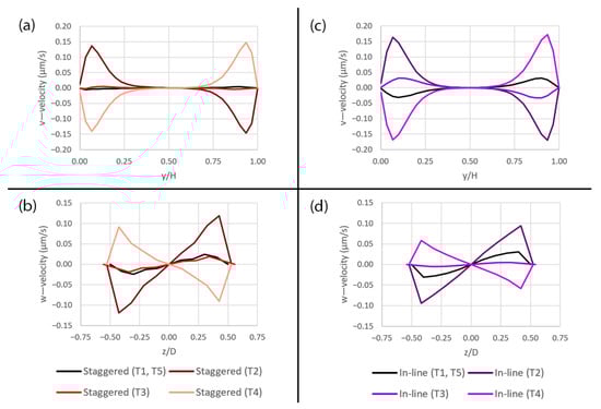 The plots of the v—velocity along the y-axis and the w—velocity along the z-axis over the pore with the diameter of 10 µm for two different pattern layouts at five different time points (T1–T5) during a deformation cycle. (a) Plots of the v—velocity along the y-axis in the staggered pattern, (b) plots of the w—velocity along the z-axis in the staggered pattern, (c) plots of the v—velocity along the y-axis in the in-line pattern and (d) plots of the w—velocity along the z-axis in the in-line pattern. The plot locations are shown in Figure 5a.