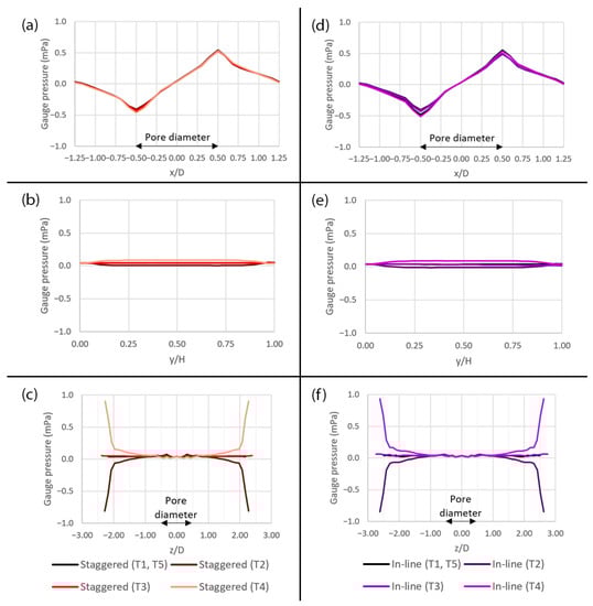 The plots of gauge pressure across the domain with the pore diameter of 10 µm for two different pattern layouts at five different time points (T1–T5) during a deformation cycle. (a) Along the x-axis in the staggered pattern, (b) along the y-axis in the staggered pattern, (c) along the z-axis in the staggered pattern, (d) along the x-axis in the in-line pattern, (e) along the y-axis in the in-line pattern and (f) along the z-axis in the in-line pattern. The plot locations are shown in Figure 5a.