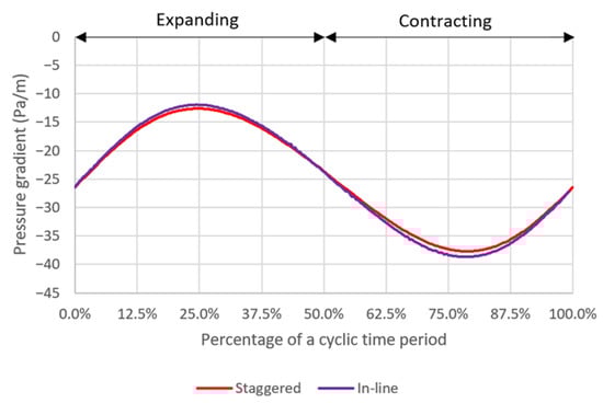 For both pattern layouts, the primary flow is visualized by the u—velocity along three axes as shown in Figure 17 and the secondary flow is visualized by the v—velocity along the y-axis and the w—velocity along the z-axis as shown in Figure 18. The pressure along three axes is shown in Figure 19 and the pressure gradient across the domain during a deformation cycle is shown in Figure 20. Overall, it is revealed that the profiles are very similar for both pattern layouts with a bit stronger variation in case of the in-line pattern. This is because the domain size in the z-direction, i.e., in the deformation direction, is greater which allows the flow to develop more than that of the staggered pattern, except that the w—velocity along the z-axis in Figure 18d has less variation in case of the in-line pattern because the distance between the pore centers along the z-axis is smaller and hence the flow cannot develop as much as that of the staggered pattern at this specific location.