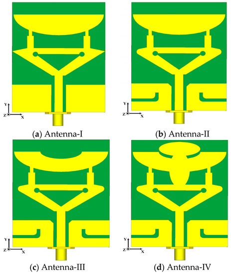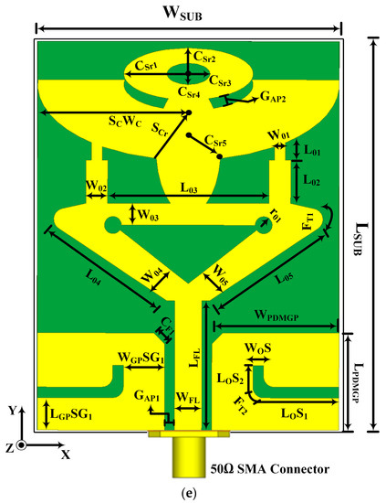 This section explains the proposed antenna mechanism operation, development stages and employed methodology. The antenna development phases are depicted in Figure 1a–d. The model employs an alternate-mixed approach and the overall antenna structure comprises an inverted triangular-shape, rectangle arms, elliptical cavity stubs, dielectric substrate, conducting material sheet (CMS), partial defected metal ground plane (PDMGP) and 50 Ω CPW feeding structure. These antenna components are etched on top of the low-cost Roger RT/Duroid 3010TM printed circuit board (PCB) laminate material with constant dielectric of relative permittivity = 11.2 and dielectric loss tangent δ = 0.0022. The front and lateral views of the radiator are illustrated in Figure 1e. The yellow and green regions represent the metallic radiating patch and the dielectric laminate. The design of semicircular inverted triangular-shaped (SCITS) slots and PDMGP with CPW feedline above the substrate forms the foundation of the envisaged radiator procedure. The CMS is placed on top of the substrate with a standard thickness of 0.035 mm. The antenna is positioned in an x-y position that is parallel to the z-axis.