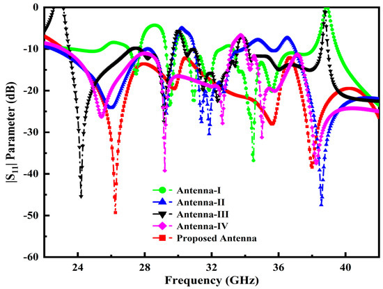 Generally, it is challenging to attain perfect matching, particularly at a higher frequency band spectrum, for 5G mm-Wave wireless communication systems. In order to address this problem, further modification has been made to the initial designed antenna dimensions by loading the L-stub slot with PDMGP to obtain impedance BW, high gain and perfect matching, as illustrated in Figure 1b. Moreover, the symmetrically L-loaded slits are truncated by filleting the upper and lower edge corners (FT2) on both sides of the PDMGP. The gap of 0.475 mm between the CPW feeding network and PDMGP structures is carefully optimized to achieve 50 Ω matching. The simulated result of the return loss |S11| parameter shows perfect matching (blue curve) as depicted in Figure 2. However, the main purpose of a design antenna is to achieve broad BW and high gain. To improve impedance matching, a further modified structure is used with an elliptically cut slit in a semicircular shape (SC), as shown in Figure 1c. Fillet (FT1) operation is set at the inverted triangular-shaped (ITS) corner edges and chamfering (CF1) cut into PDMGP on both sides. After performing a truncated SC-shaped elliptical stub, significant matching is obtained. To arrive at the desired objective, two more elliptical cavity radial stubs (CSr1 and CSr5) are interconnected with the antenna, as depicted in Figure 1d. To achieve broad BW optimal results, we have engraved another elliptical cavity slot stub, CSr3, cut from CSr1. Moreover, a symmetrical loaded L-shaped slot and an ITS with cavity radial stubs form the finalized compact radiating patch antenna prototype, as displayed in Figure 1e. The proposed antenna possesses overall small dimensions of 1.381λ0 × 1.08λ0 × 0.098λ0.