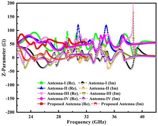 Additionally, the antenna performance is significantly impacted by the inserting slots and their locations, tuning stubs and the gap (GAP1) between the PDMGP and CPW-feed; as a result, a broad impedance BW, enhanced high gain and flawless matching over a broad frequency range are achieved. The return loss |S11| parameter performance of the developed antenna prototypes is elucidated in Figure 2. It can be demonstrated that the proposed antenna structure obtained the perfect matching of fractional BW (red curve) from 23–42 GHz. Figure 3 depicts the simulated variation of the real and imaginary parts of the z-parameter. The plot shows that the input impedance of the port of the developed antenna was matched with the normalized z value of 50 Ω at the operable resonances.