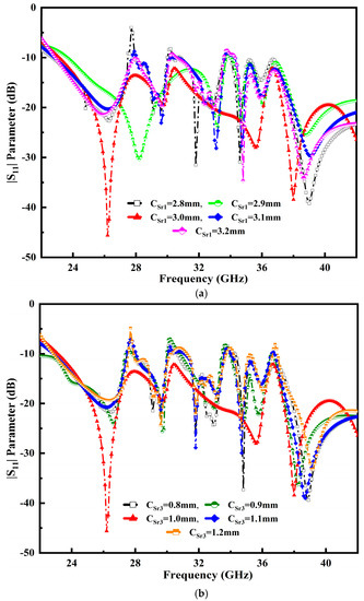 The composition of the semicircular radial cavity stub and elliptically loaded profiles is used to achieve antenna parameter accuracy. We embedded two cavity stubs from the initial design for the primary radiating purpose. The radiator of a developed antenna’s impedance-matching performance is influenced by the size of the cavity radial stub 1 (CSr1) and cavity radial stub 3 (CSr3). The proper impedance matching and broader BW are attained at a main radiator patch size of 3.0 mm, as illustrated in Figure 4a. Moreover, at the value of CSr3 1.0 mm, ideal matching is obtained as shown in Figure 4b.