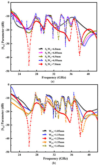 Influence of variation of variables: (a) return loss |S11| of the semicircular radiator (SCWC), (b) feedline width (WFL) over the operable frequency range.