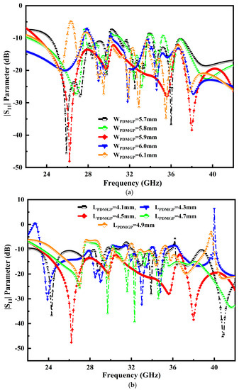 The performance position of the CPW-e with defected ground surface is analyzed to improve the impedance characteristics. It is difficult to adjust the gap dimension between two partial defected ground planes with the center of the strip line. Figure 6a depicts the various opti-metric values used for the width of the partial defected metal ground planes (WPDMGP), ranging from 5.7 mm to 6.1 mm. It is observed that the proposed antenna attains proper matching at 5.9 mm, visible in a solid red line. Moreover, the effect of an L-shaped slot is truncated from the ground plane to obtain a broader BW. The variation in the length of partial defected metal ground plane (LPDMGP) values ranging from 4.1 mm to 4.9 mm is fixed. It is noted that the proposed antenna reaches proper matching at 4.5 mm, as portrayed in Figure 6b.