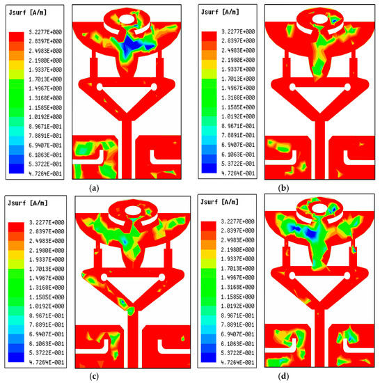 Surface current distribution (JSURF) at multiple frequencies: (a) 26.25 GHz, (b) 29.75 GHz, (c) 35.65 GHz, and (d) 38 GHz of the proposed antenna structure.