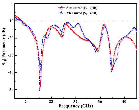 The slight changes in the results may be due to the fabrication tolerances in the manufacturing of the substrate material, thickness, loss tangent or relative permittivity values, and improper soldering. It is clearly seen that the antenna’s simulation design has a broader impedance BW range from 23–42 GHz, resulting in 58.46%, which can be resonated at multiple frequencies. Moreover, the other two resonances are centered at 29.75 GHz and 35.65 GHz as depicted in Figure 9. As can be seen in the measured results (blue curve), at 35.65 GHz resonance there has been a slight shift in the resonance in the simulated result. Small variations have been obtained due to the glossy substrate material and the defective soldering of the SMA connector. Besides, higher resonance is observed at 38 GHz. The 28 GHz/38 GHz frequency band for mm-Wave 5G wireless communication systems may also be covered.
