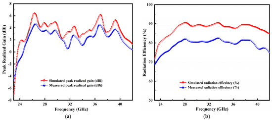 The simulation and measurement results of peak realized gain and radiation efficiency against the designated frequency span are presented in Figure 10a,b. The measured gain of the fabricated antenna is determined using the Friis transmission equation. The antenna model simulation result exhibited a high gain of 6.75 dBi and ~5.0 dBi at 27.2 GHz and 29.75 GHz. Similarly, an acceptable gain is observed at different frequency resonances. Values of 3.3 dBi and 3.05 dBi are achieved at 35.65 GHz and 38 GHz resonances. Moreover, two identical, known gain standard horn antennas were used to assess the peak realized gain of the manufactured antenna samples. During the measurement process, samples of the indoor antenna in the anechoic chamber were lost, resulting in a 0.5 dBi discrepancy in the peak realized gain, as illustrated in Figure 10a.