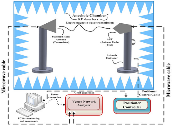 The proposed antenna radiation patterns in the standard planes are measured inside the anechoic chamber under far-field conditions. In Figure 11a,b, the arrangement of the antenna under test (AUT) is depicted. The elevation (E-plane) and Azimuth (H-plane) of the manufactured antenna prototype are measured inside the anechoic chamber room. Moreover, the radio-absorbing material has been used to cover the indoor measurement facility walls. AUT was placed at the distance of the standard horn antenna. The positioner controller has been used to operate the proposed model table, which is wired via Ethernet to the computer. The AUT (receiver) and the typical standard horn antenna (transmitter) were set in a line of sight (LOS) at a specific distance. In addition, the AUT port is connected with a microwave cable (purple color) to the VNA as can be seen in Figure 11a. The installation of a computer allows for monitoring of measurement results, executing commands and storing measured data. The overall measurement setup is graphically represented in Figure 12.