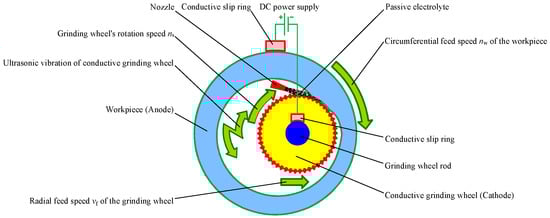 Electrochemical grinding (ECG) is a hybridized grinding technology combining electrochemical machining (ECM) with conventional mechanical grinding [,]. Its advantages, namely, high machining efficiency, small grinding force, good surface quality, and minor wheel wear, substantiate its wide applications in the precision and ultraprecision machining of difficult-to-machine materials such as stainless steels, titanium alloys, superalloys, and metal matrix composites. Ultrasonic-assisted electrochemical grinding (UAECG) is a novel hybridized electrochemical grinding technology developed by combining ultrasonic vibration-assisted machining [,] and electrochemical grinding [,]. Compared with ordinary ECG, the UAECG process is more stable [], the grinding force is smaller [,], the conductive grinding wheel wear is alleviated [], and the machined surface roughness is reduced [,,,]. Therefore, with high-end equipment and precision machinery technology development, UAECG is receiving increasing attention and application in industry.
