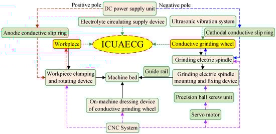 With the development of grinding technology, more and more 4- and 5-axis CNC machines and regular machine tools have been applied to hybridized grinding [,,,] and super abrasive machining [,] after a certain degree of transformation. Therefore, for ICUAECG, its special machine tool can be transformed from a regular machine tool.